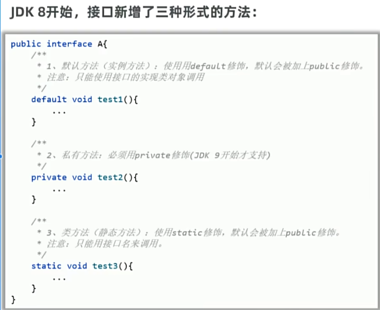 例如:多个实现类实现了接口A后期需要新增一个方法,此时可以新增一个实例方法,不用重写所有的实现类。