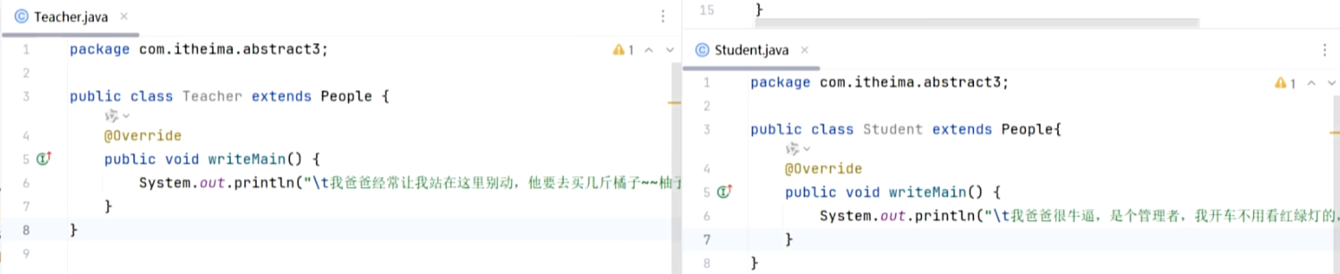 3、一个类继承抽象类,或者实现接口,都必须重写完他们的抽象方法,否则自己要成为抽象类或者报错!
