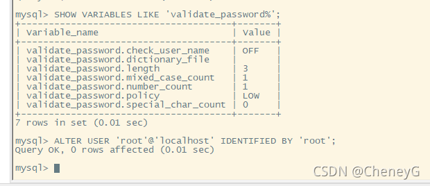 SHOW VARIABLES LIKE 'validate_password%';修改密码规则: