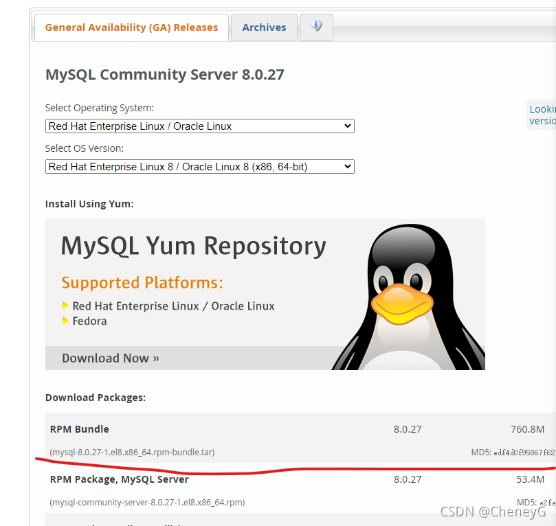 如果想使用CentOS8版本,可以直接点击下载:Download MySQL8.0.27 然后跳过下载步骤