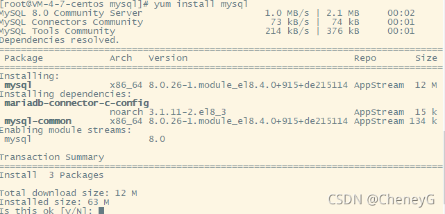 yum install mysql-server过程中会询问是否安装,输入“y”即可:Is this ok [y/N]: