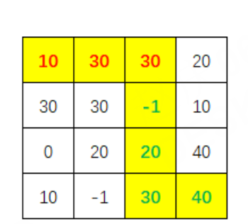 | 输入 | 4,4 10,30,30,20 30,30,-1,10 0,20,20,40 10,-1,30,40 |