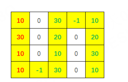| 输入 | 4,5 10,0,30,-1,10 30,0,20,0,20 10,0,10,0,30 10,-1,30,0,10 |