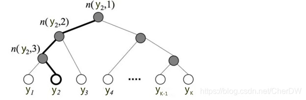 树的结构是根据类别标记的频数构造的霍夫曼树。K个不同的类标组成所有的叶子节点,从根节点到某个叶子节点经过的节点和边形成一条路径,路径长度为。需要计算目标词