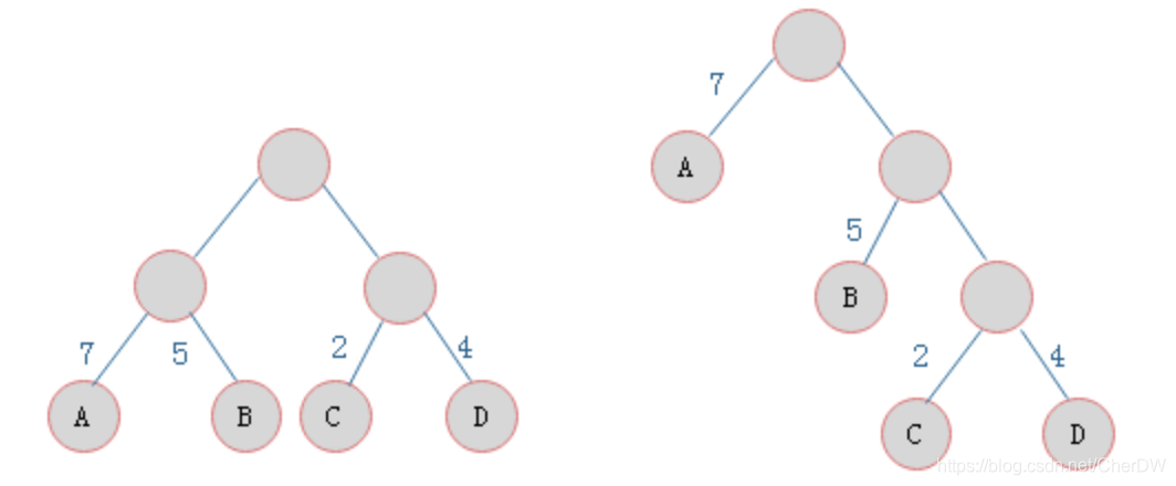 如左图所示两棵二叉树,叶子结点为A、B、C、D,对应权值分别为7、5、2、4。树的带权路径长度规定为所有叶子结点的带权路径长度之和,记为WPL。