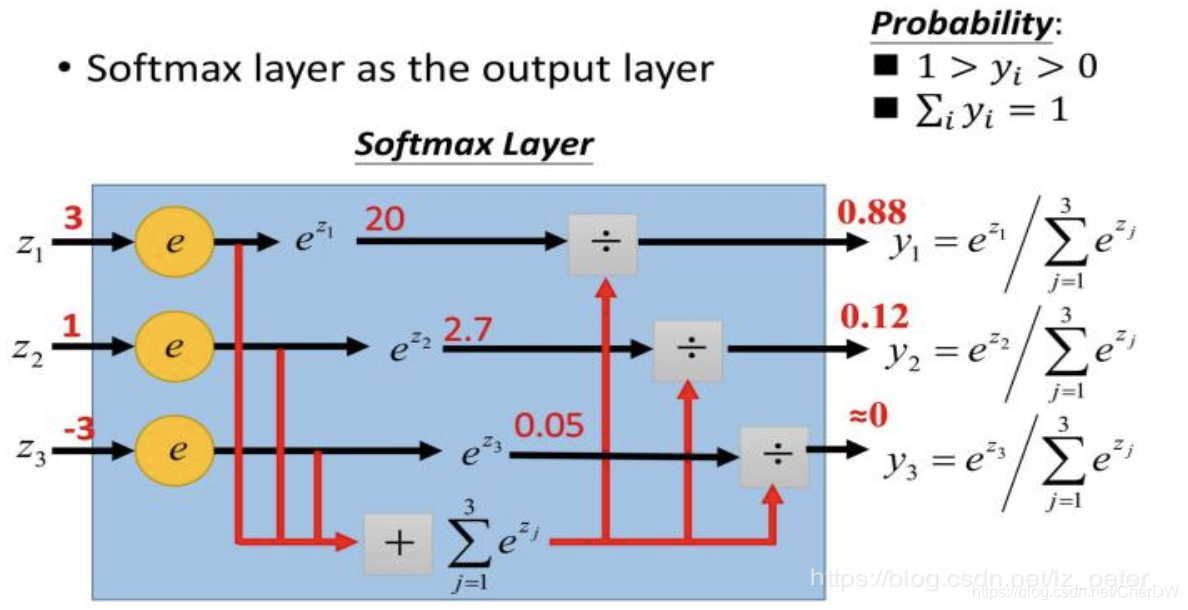 softmax函数又称为归一化指数函数,常在神经网络输出层充当激活函数,它是二分类函数sigmoid在多分类上的推广,目的是将多分类的结果以概率的形式展现出来。下图为softma x的计算过程:
