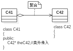①如C41聚合C42,但是C42可以离开C41而独立存在。在创建C41类的对象时,一般不会马上创建theC42对象,而是等待一个外界的对象传给它。