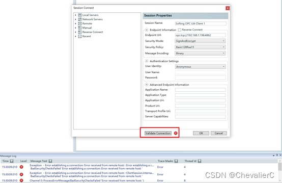 1、验证连接,由于设置的有安全策略及安全模式,会提示验证失败,此时在服务器侧已产生安全证书,不过,该安全证书处于被拒绝的状态