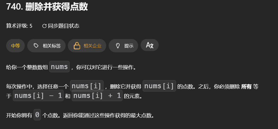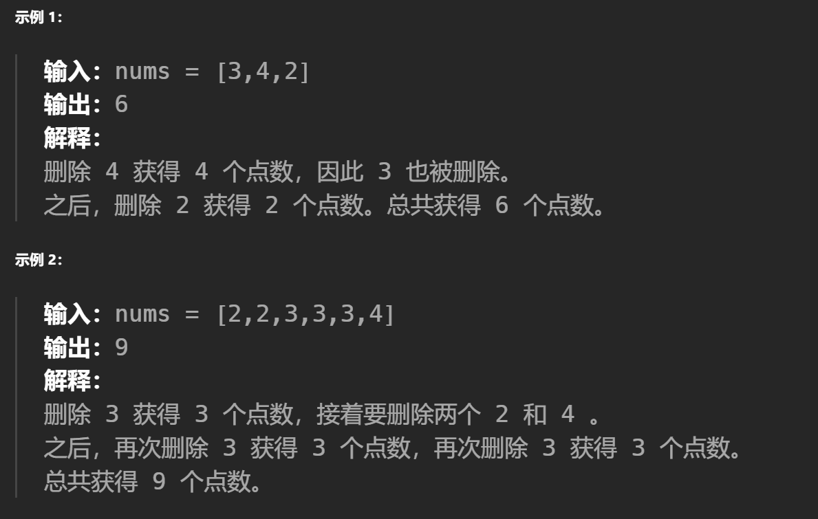 首先理解这个题目的含义。选择了整数nums[i]之后你能获取它的点数,并且把这个元素数学相邻的元素删除: