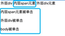 当单击span元素,会出发span元素的点击事件,会输出三条记录。单击span的同时,也单击包含了span元素的div元素和包含div元素的body,并且每一个元素都会按照特定的顺序响应click事件。
