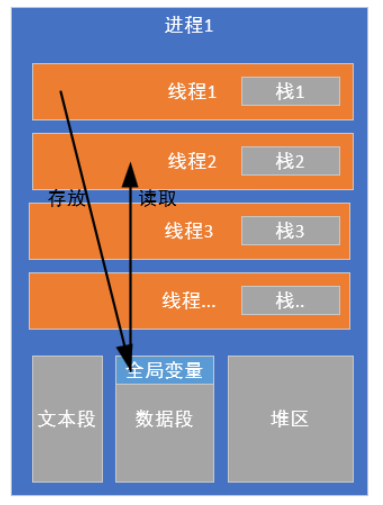 一个进程中的多个线程独享栈空间,文本段、数据段、堆区进程多线程共享