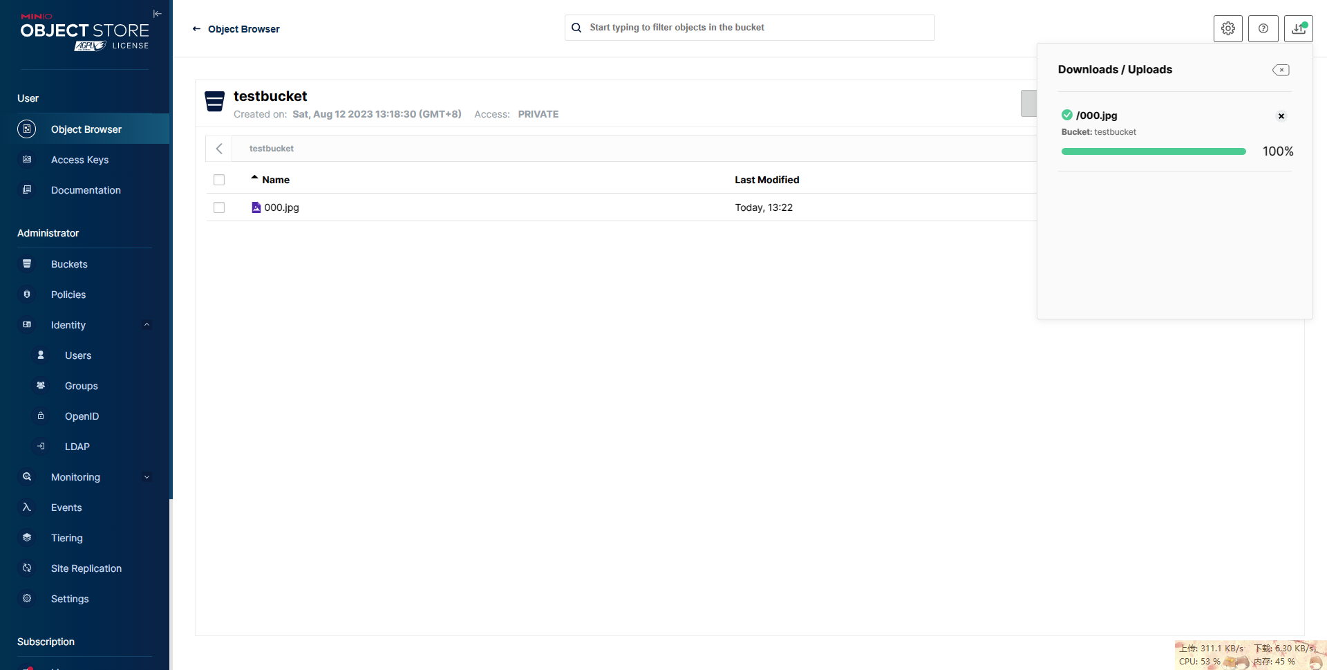 '001.jpg' 文件路径验证成功 文件:>> '001.jpg' 已上传至桶:>> 'testbucket'.