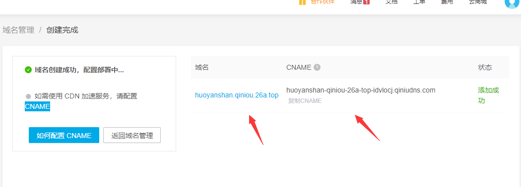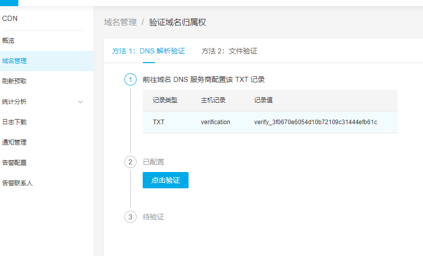 - 验证成功以后根据提示配置CNAME