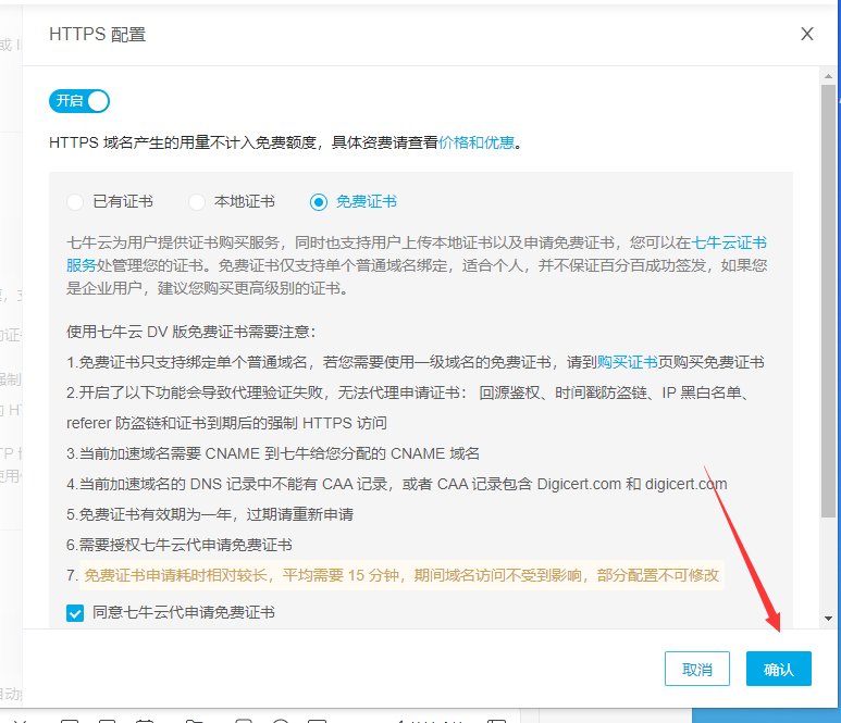- 然后建议选择免费证书,然后同意七牛云申请免费证书-点击确认