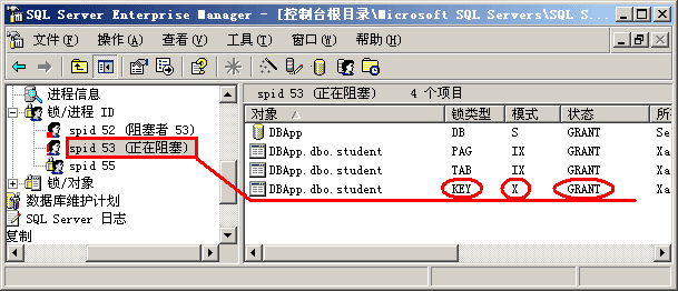 第四步,了解了上面发生的事情后,我们现在可以深入讨论一下共享锁和排它锁的使用情况了。重新回到企业管理器界面,让我们查看一下两个进程各占用了什么资源。从图 2-10中我们可以看出,53号进程(事务2)在执行更新命令前对相应的键加上了排它锁(X锁),按照前文提到的1级封锁协议,该排它锁只有在事务2提交或回滚后才释放。现在52号进程(事务1)要去读同一行数据,按照2级封锁协议,它要首先对该行加共享锁,然而 该行数据已经被事务2加上了排它锁,因此事务1只能处于等待状态,等待排它锁被释放。因此我们就看到了前面的"阻塞"问题。