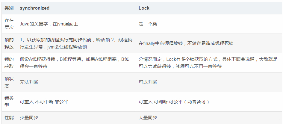 - 【Lock】不易操作,但非常灵活。加锁和解锁需要手动进行,且次数需一样,否则其他线程无法获得锁。发生异常时候,不会主动释放占有的锁,必须手动 unlock 来释放锁,可能引起死锁的发生。最好将同步代码块用try catch包起来,finally 中写入 unlock,避免死锁的发生。