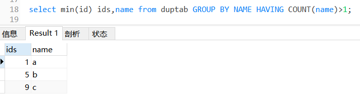 select min(id) ids,name from duptab GROUP BY NAME HAVING COUNT(name)>1;