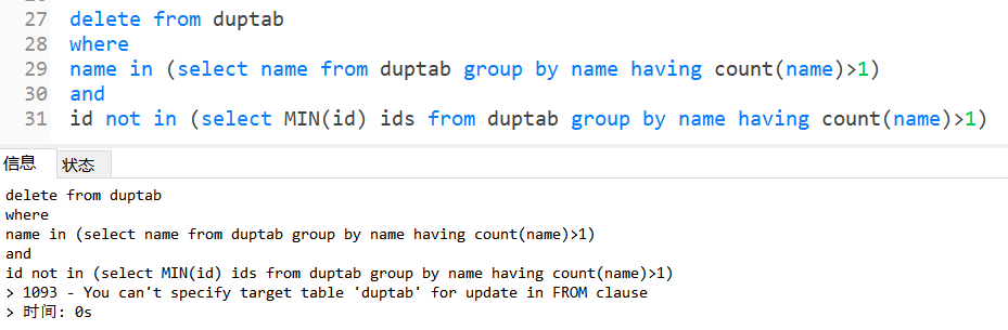 报错:You can’t specify target table 'duptab ’ for update in FROM clause。【不能在 from 子句中为 update 指定目标表“duptab ”】不能在同一表中查询的数据作为同一表的更新数据。