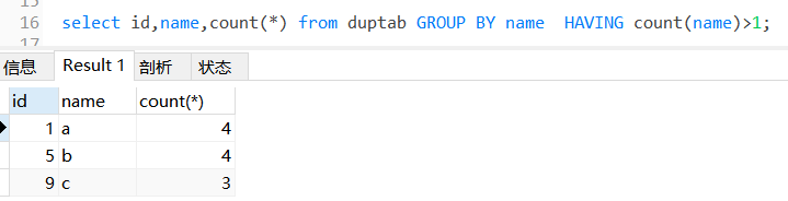 select name,count(*) from duptab GROUP BY name HAVING count(name)>1;