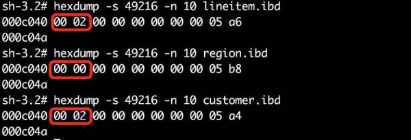 接下来用 hexdump 工具,查看表空间文件指定偏移量上的数据: