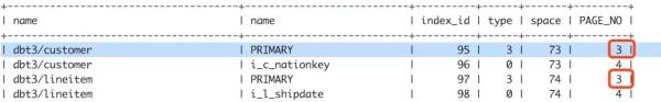 可以看出数据库 dbt3 下的 customer 表、lineitem 表主键索引根页的 page number 均为 3,而其他的二级索引 page number 为 4。