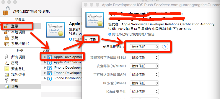 今天用Xcode打包IPA文件给同事,结果提示import时,提示证书missing,找了半天没发现问题,后来打开钥匙串,发现证书全失效了!!!吓死宝宝了~~~~(>_<)~~~~