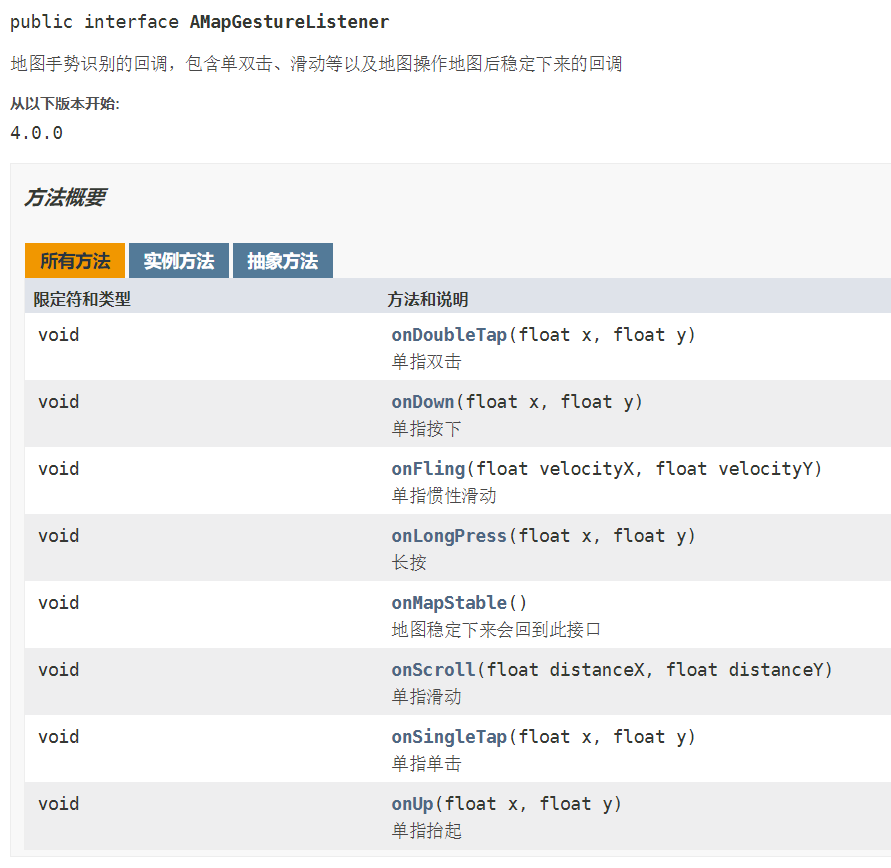 通过观察饿了么的效果图我们可以发现:但地图在移动的过程中,中间点是需要上移的,同时下方的阴影变大,当松手以后返回原来的位置以及效果。刚开始的时候我是想通过高德的API来实现,我最终找到的接口是:setAMapGestureListener(),这个方法是监听地图手势识别,需要传入AMapGestureListener实例。
