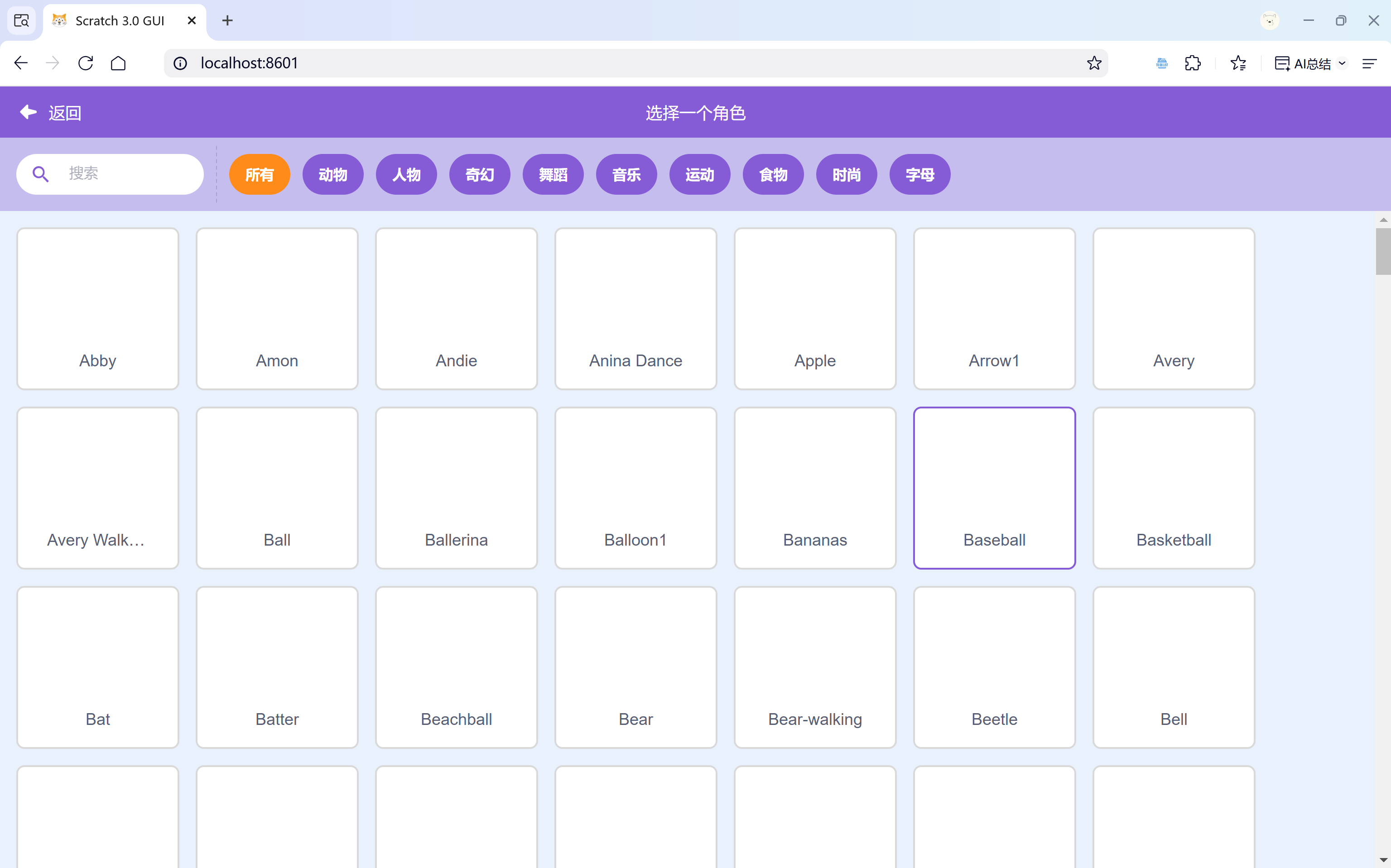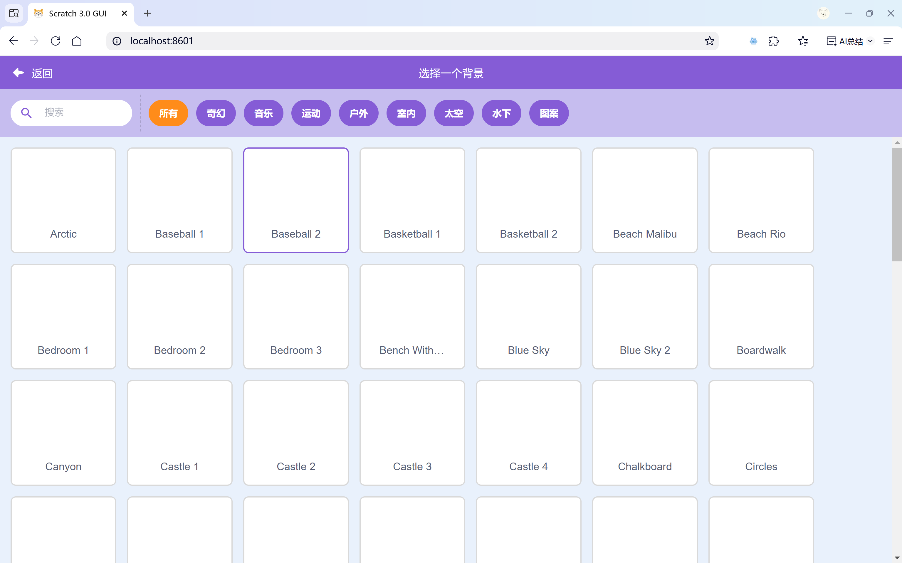 不显示图片和背景是有可能是因为默认的`scratch-storage`是从Scratch官网下载资源,如果“翻墙”之后再打开是可以正常显示仓库里的图片和背景。