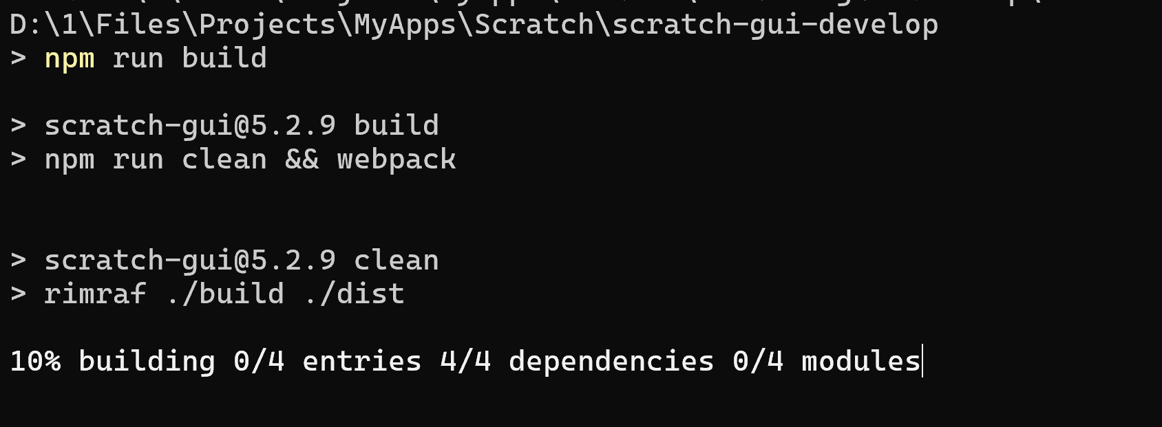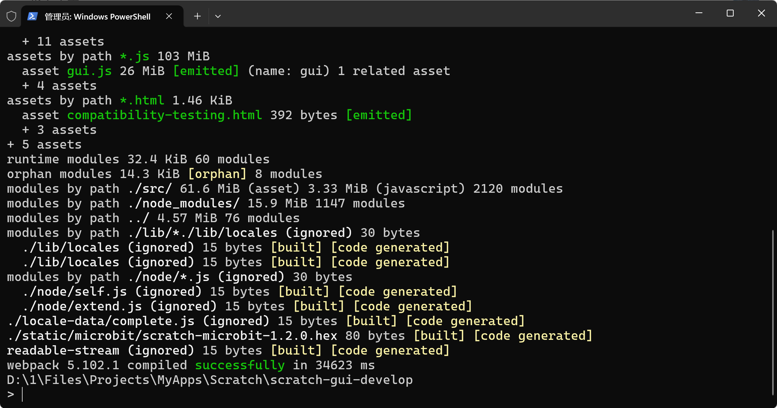 3、执行"npm run build"命令,编译本地`scratch-gui`