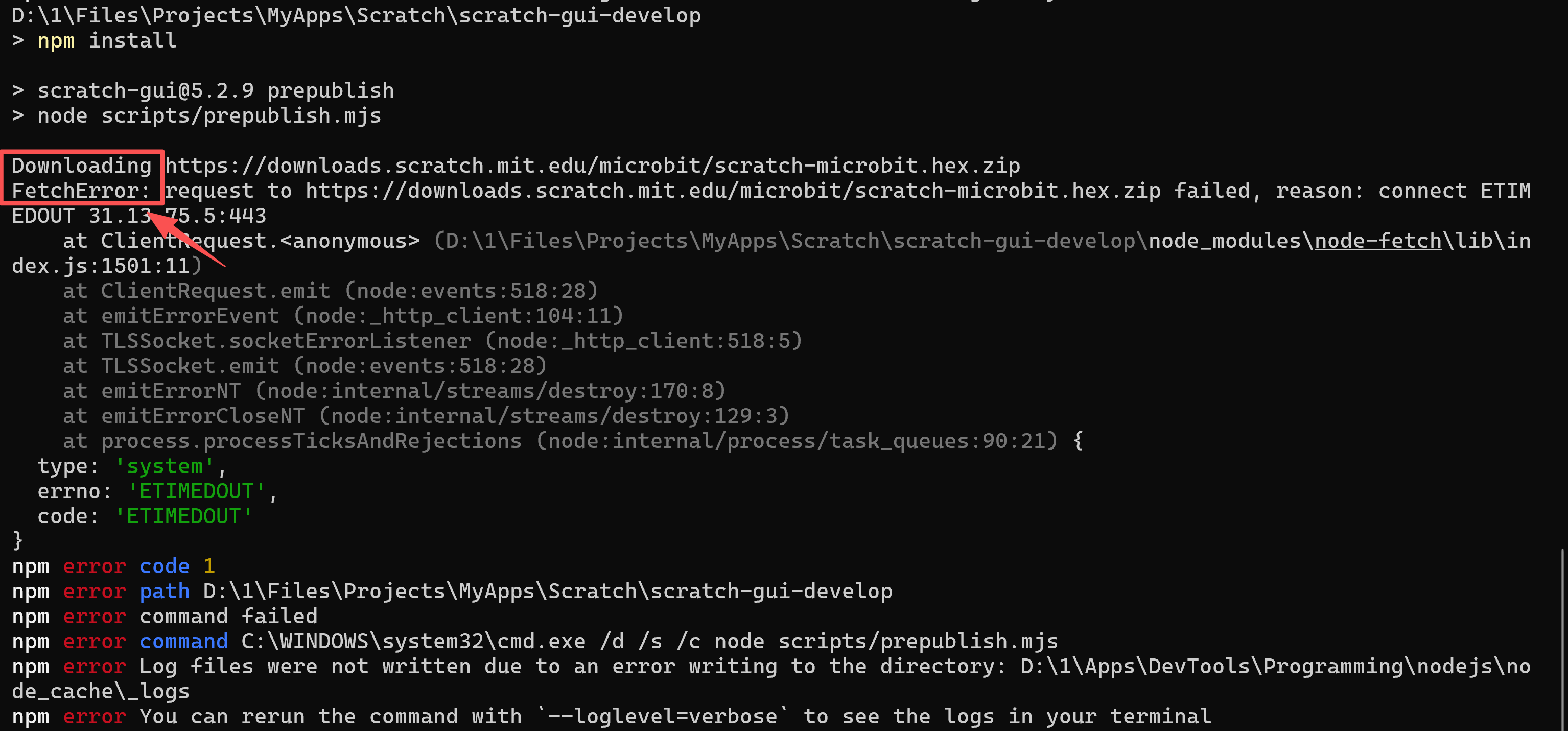 由于Scratch官方网站国内是无法直接访问的,如果出现下图中的下载错误,则需要“翻墙”后再执行"npm install"命令。