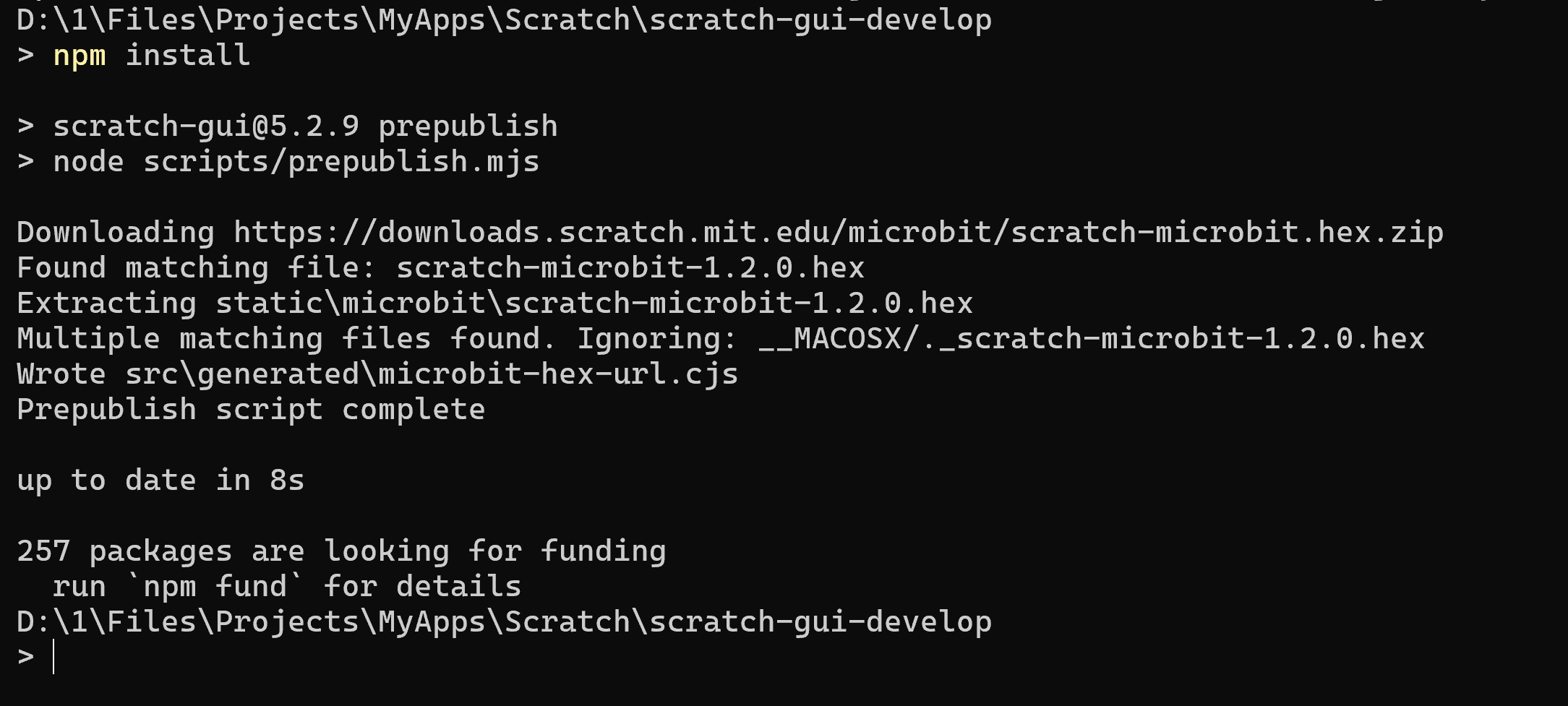 2、在scratch-gui-develop目录下执行"npm install"命令