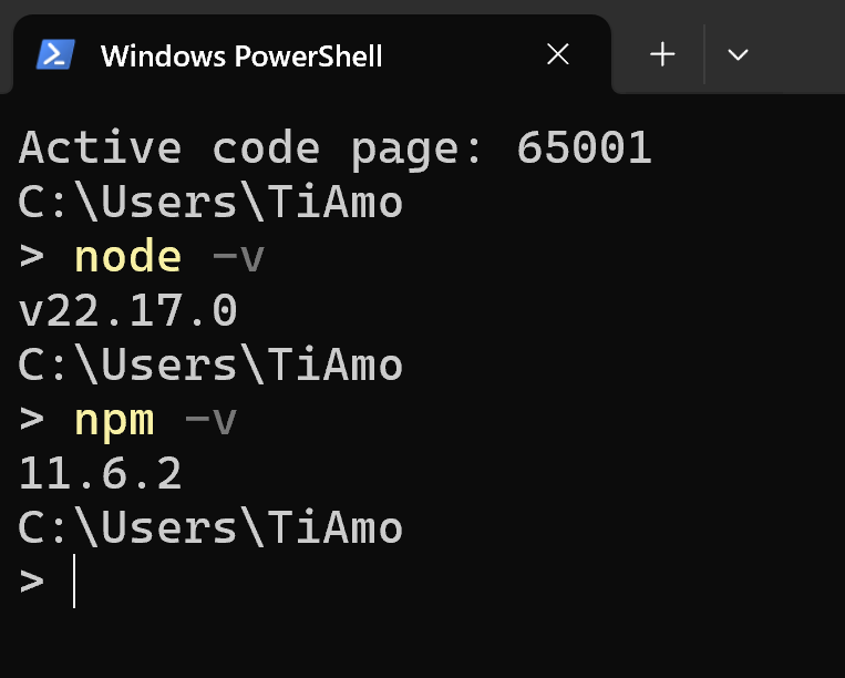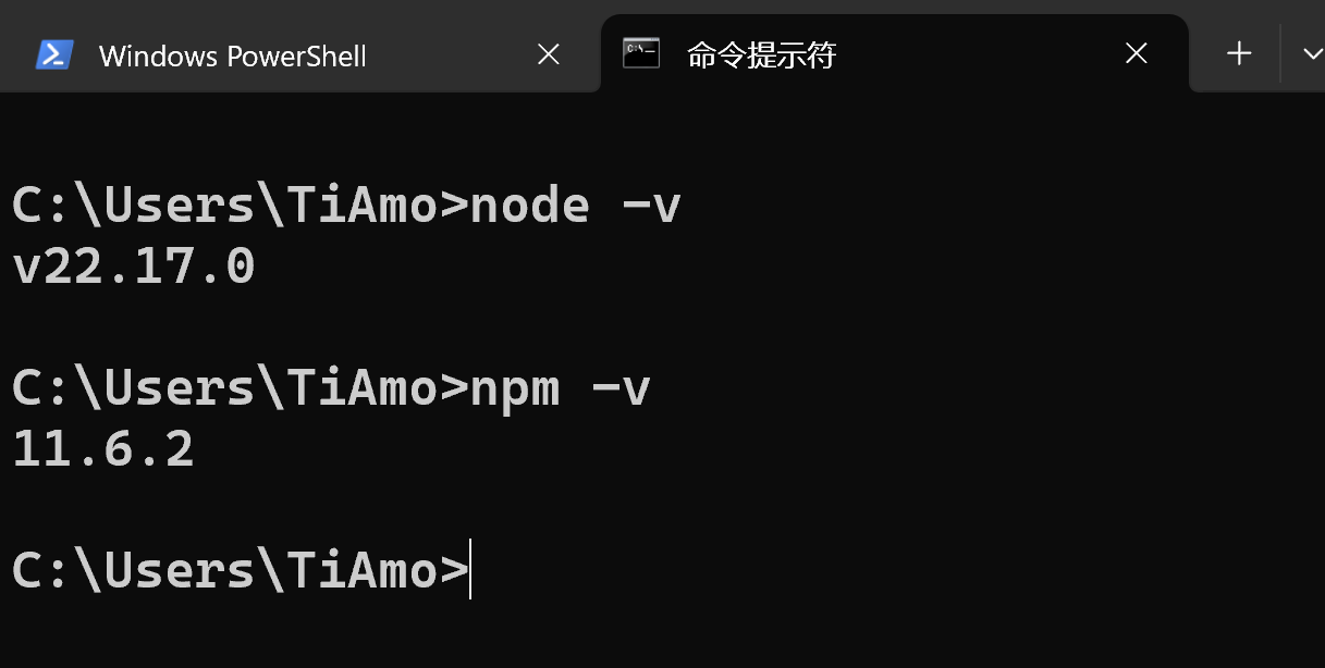 1、打开PowerShell,依次运行"node -v","npm -v"