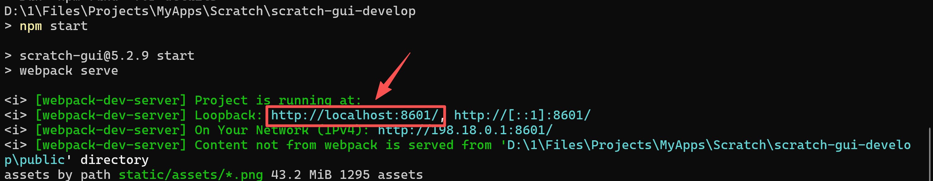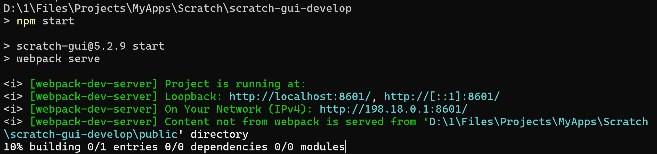 4、执行"npm start"命令,在本地服务器上运行Scratch