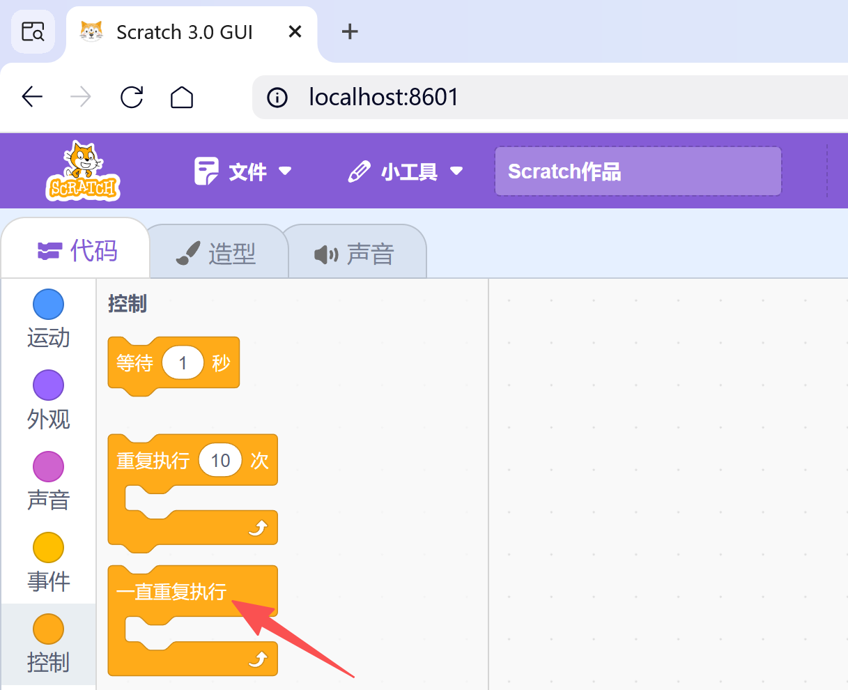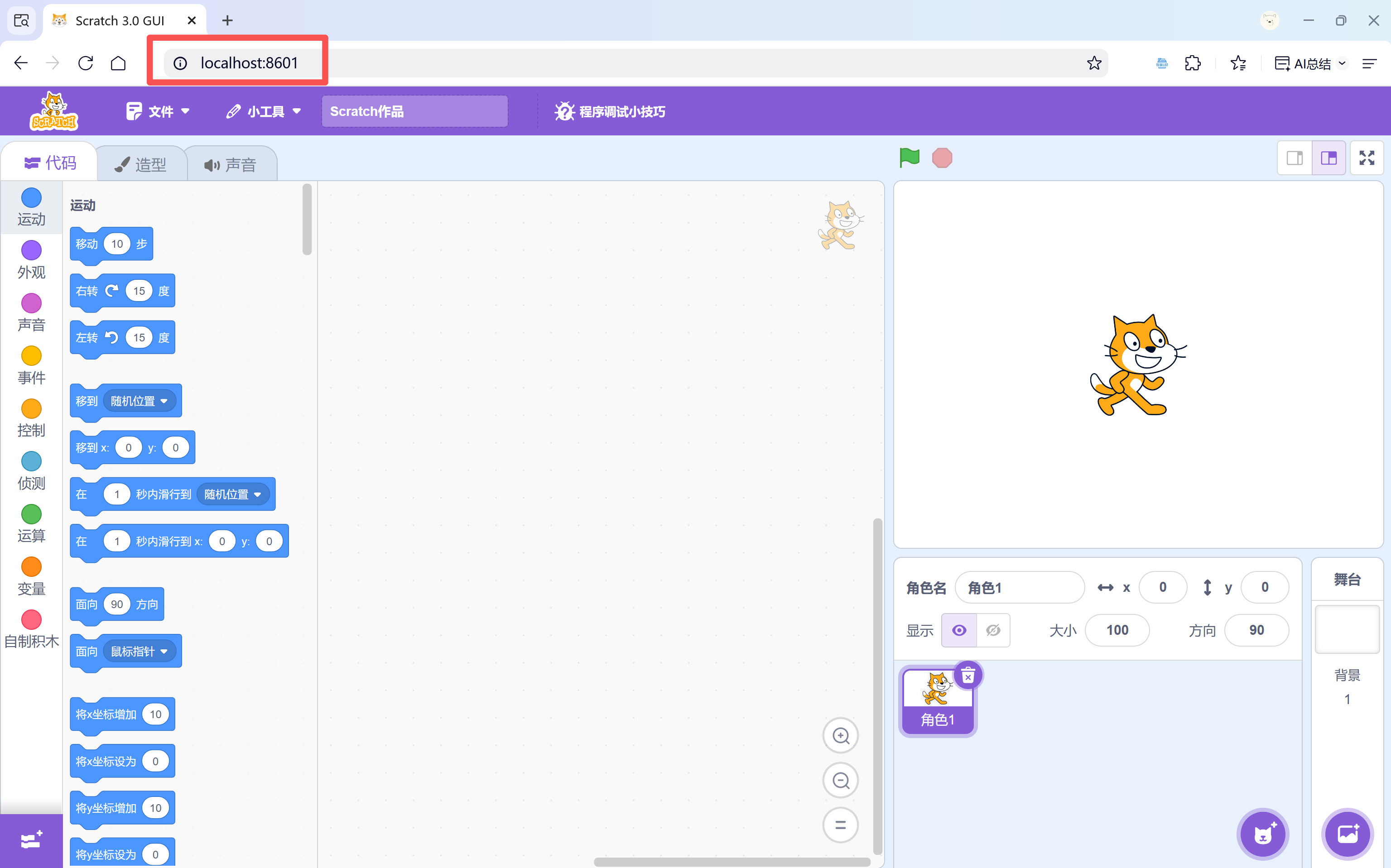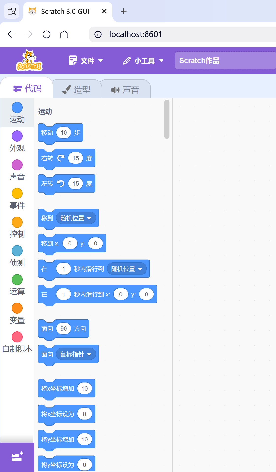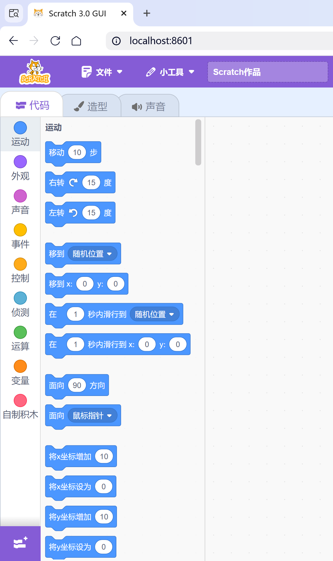 我们之前把`scratch-blocks`源码解压到本地后并没有对他进行任何操作,此时的`scratch-gui`使用的是从Scratch官网下载的`scratch-blocks`,并没有使用我们本地的源码。