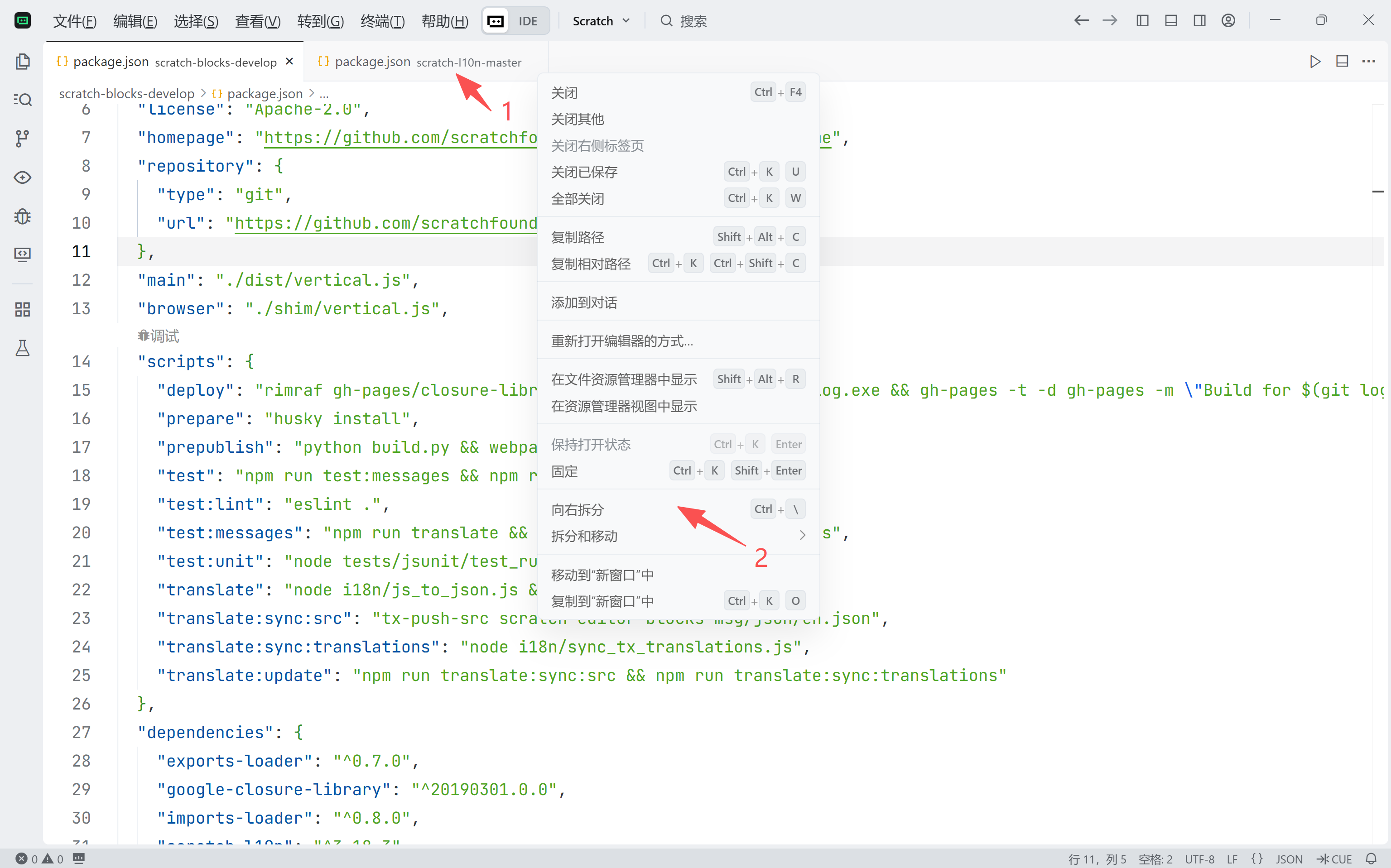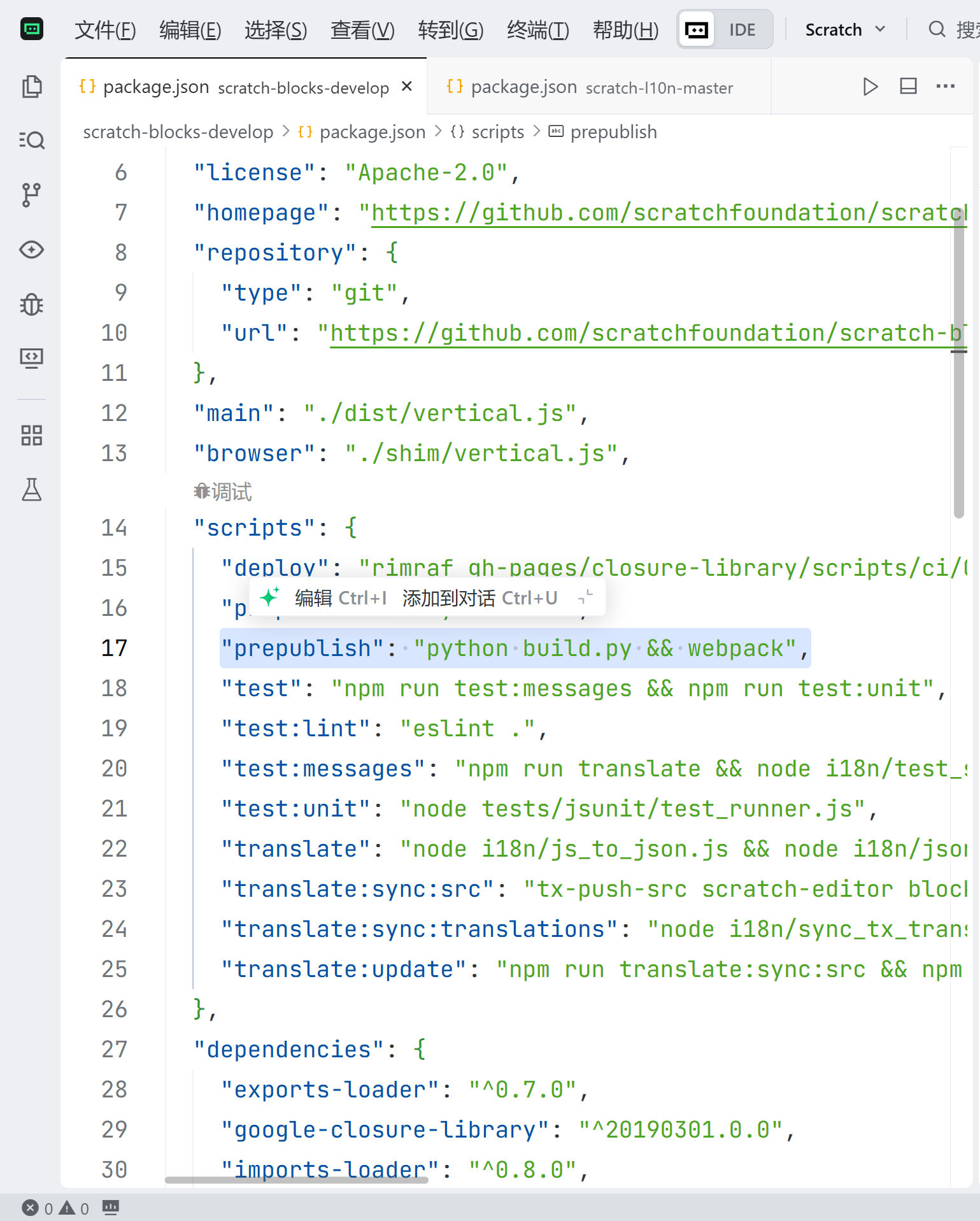 分别打开`scratch-l10n`和scratch-blocks`的`package.json`对比一下: