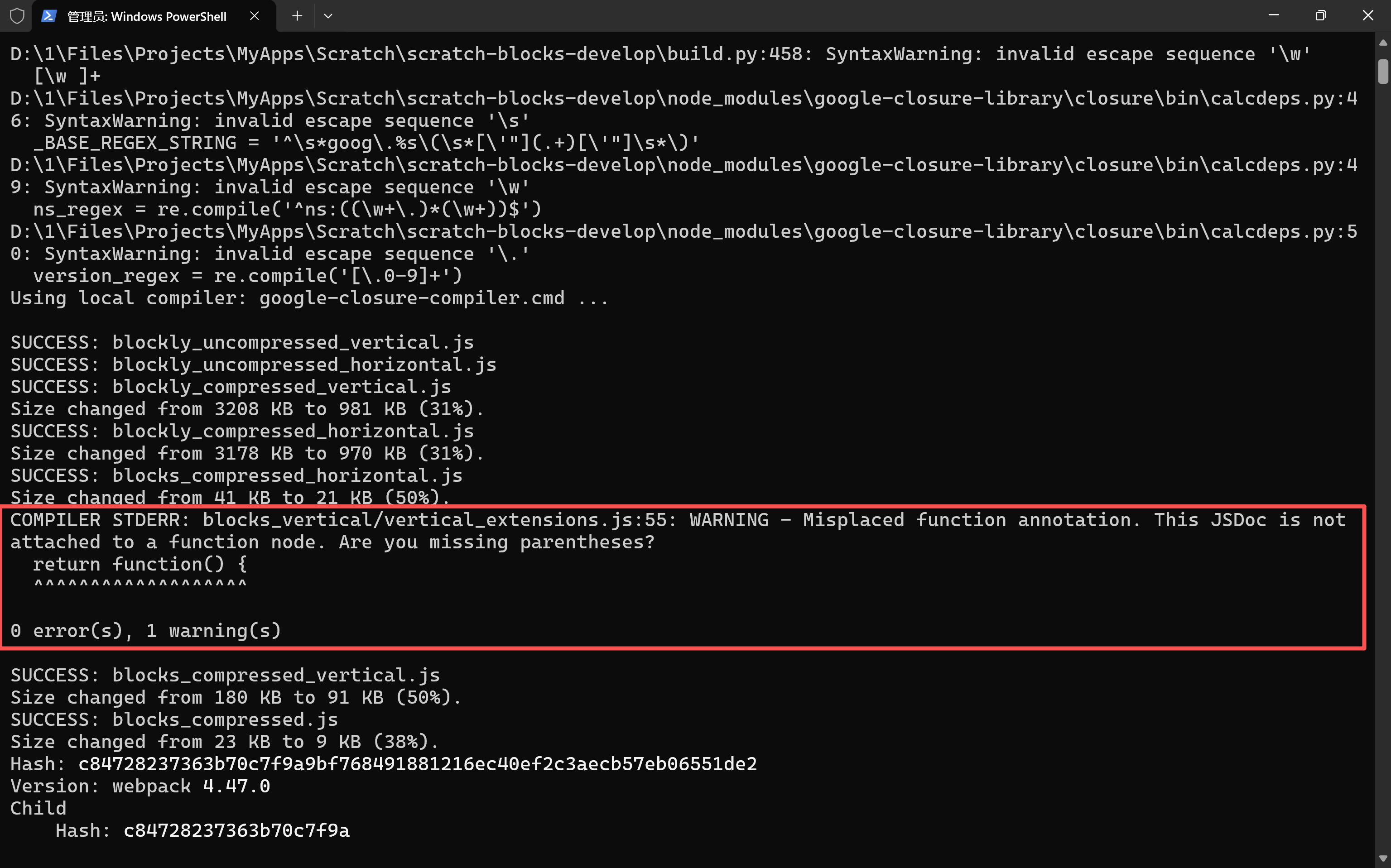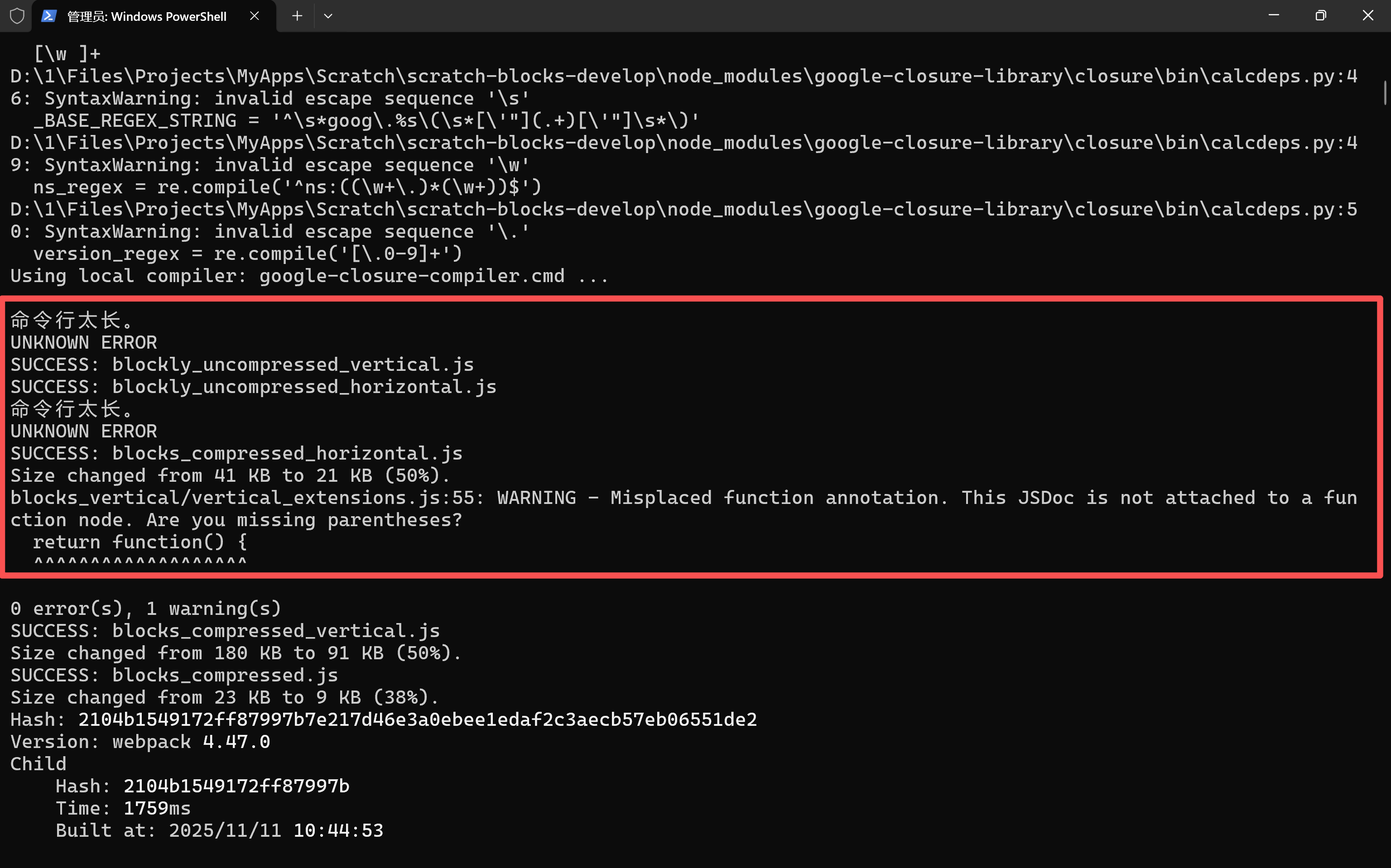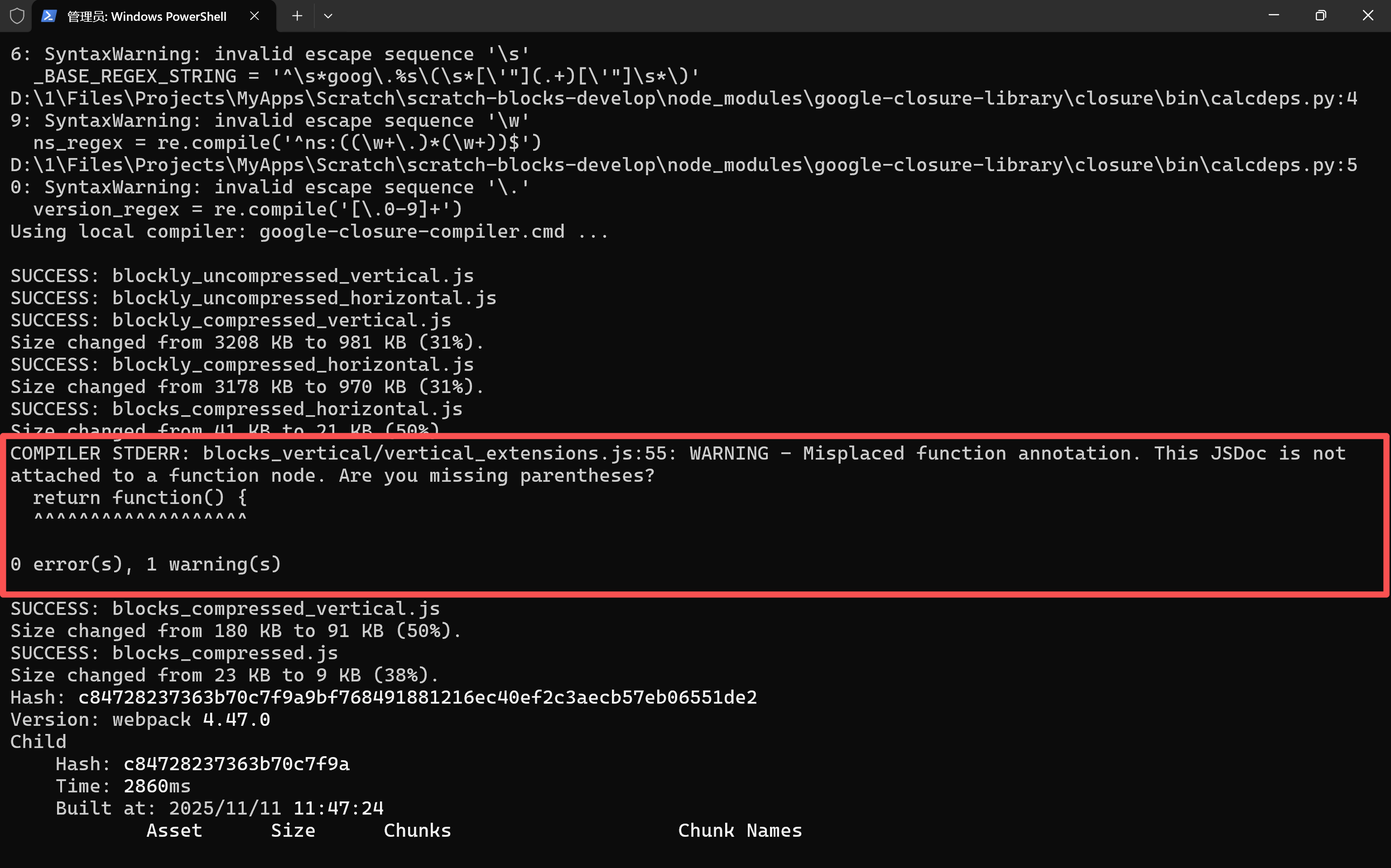 剩下的错误JSDoc警告 是一个非关键警告,关于 blocks_vertical/vertical_extensions.js 中的函数注释位置,但这不影响构建结果
