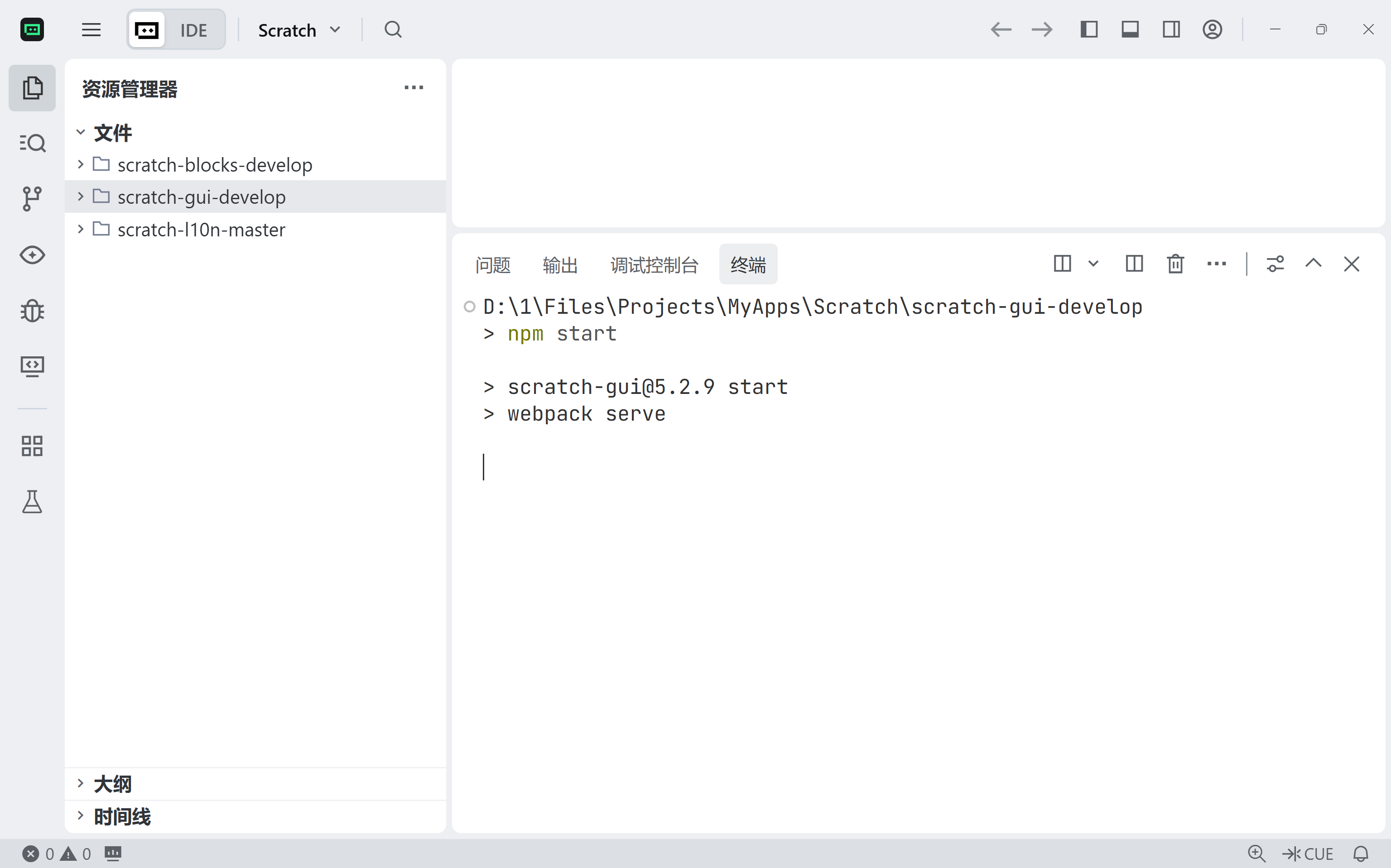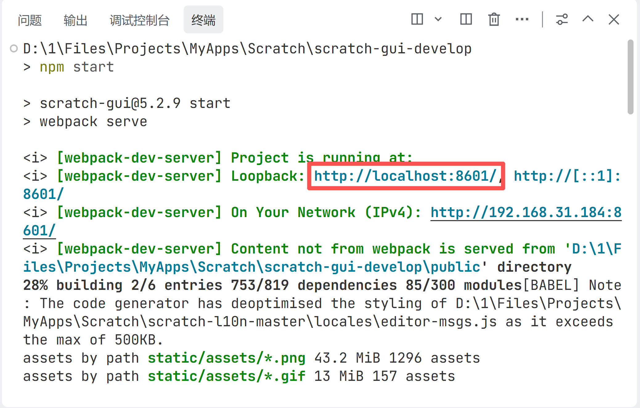 使用终端在`scratch-gui-develop`文件夹下执行`npm start`命令。