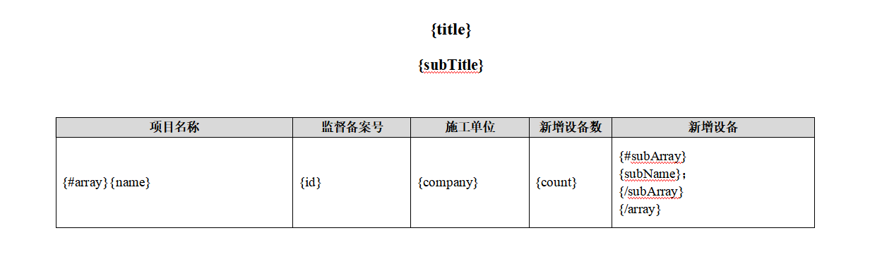②、需要遍历数组时,同样用花括号{}包裹,以#号开头,/号结尾,表示一个循环体结束。如果存在嵌套数组,也是一样的道理,可不进行扁平化处理。存在合并表头不要担心,其值只与列相关,正常插入字段就行。
