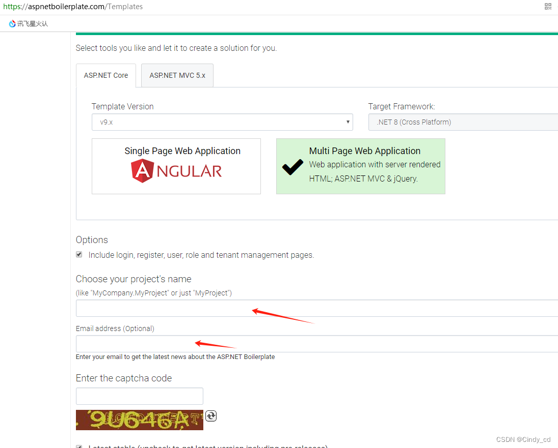 选择Multi Page web Application,在下边数据项目名称、邮箱、验证码就可以创建自己的项目了