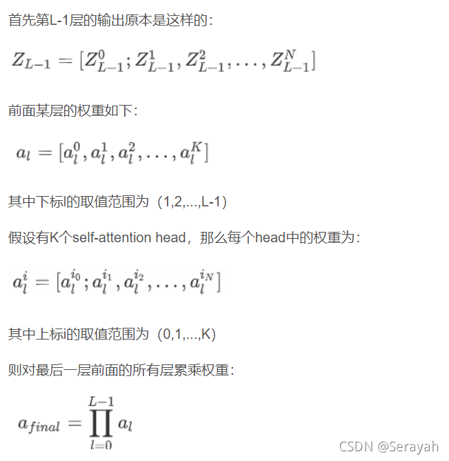 为了充分利用注意力信息,将改变最后一层的输入,对最后一层前面的所有层的权重累乘,选出
