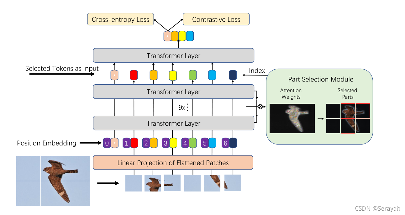 TransFG主要有两部分不同:部分选择模块(PSM)和对比特征学习