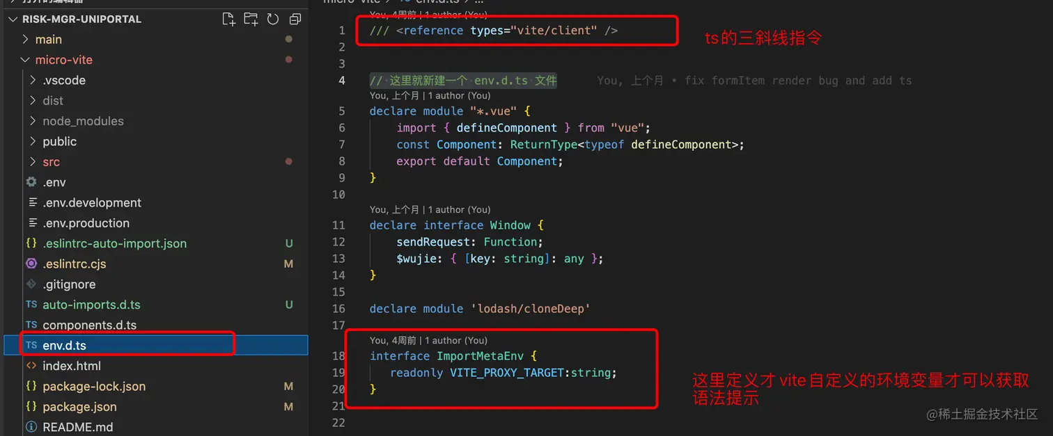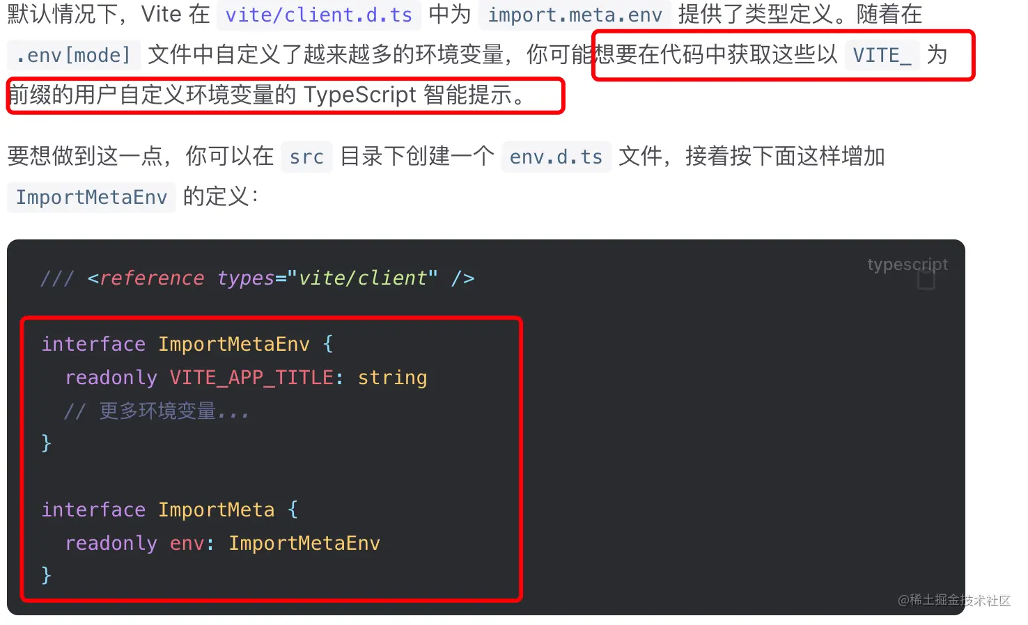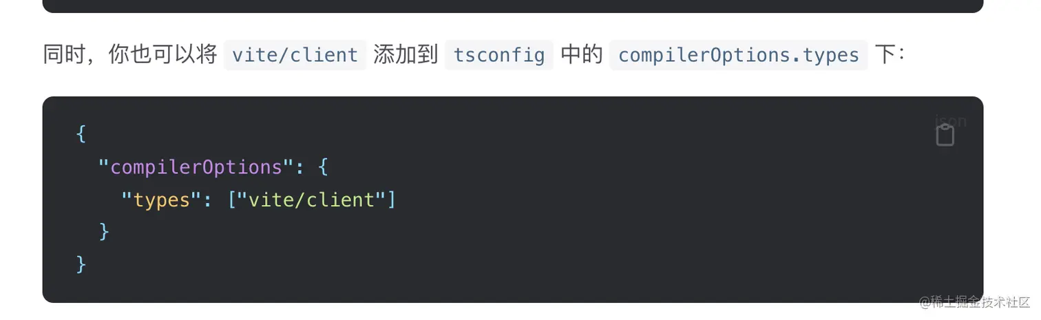 客户端类型 Vite 默认的类型定义是写给它的 Node.js API 的。要将其补充到一个 Vite 应用的客户端代码环境中,请添加一个 d.ts 声明文件: