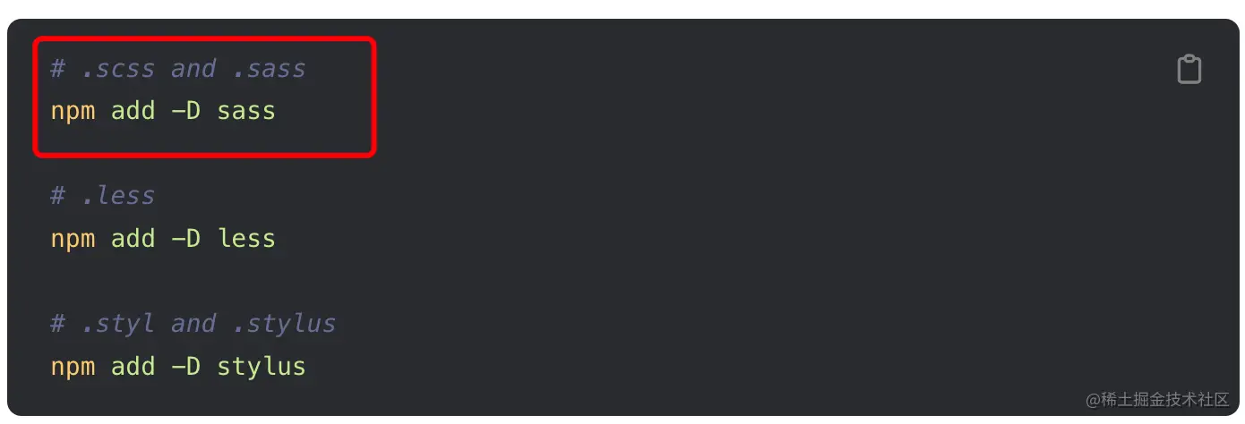 由于 Vite 的目标仅为现代浏览器,因此建议使用原生 CSS 变量和实现 CSSWG 草案的 PostCSS 插件(例如 postcss-nesting)来编写简单的、符合未来标准的 CSS。 话虽如此,但 Vite 也同时提供了对 .scss, .sass, .less, .styl 和 .stylus 文件的内置支持。没有必要为它们安装特定的 Vite 插件,但必须安装相应的预处理器依赖: