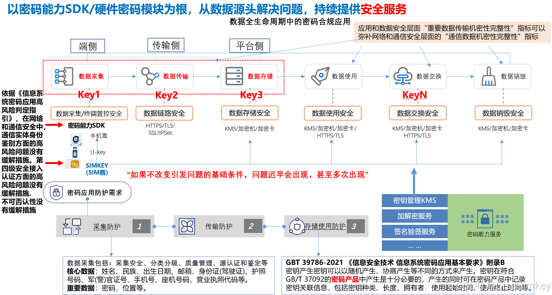 根据数据的重要情况可以选择硬件密码模块,或者自行研发的SDK,注意如果数据量不大,每秒k级,可以选择SIM卡密码模块。怎么提供加密性,完整性,真实性,之前已经讲过多次。推荐【SM4_CBC+HMAC,SM4_GCM】。
