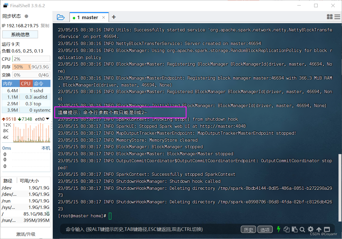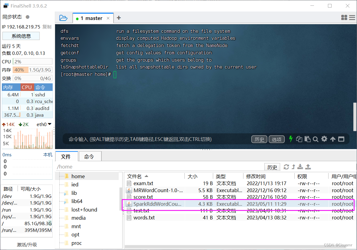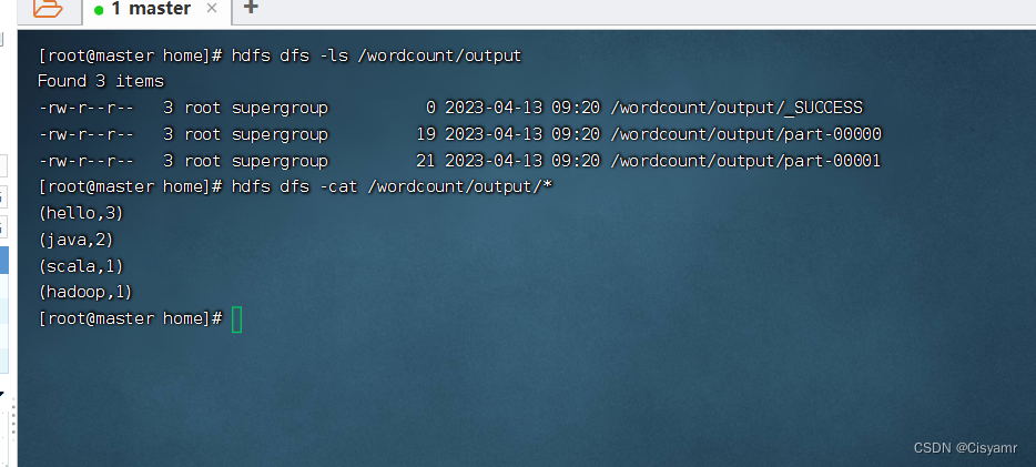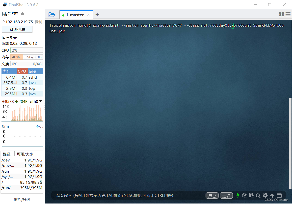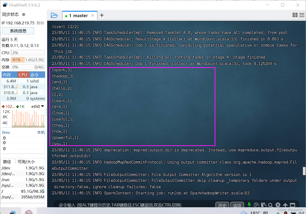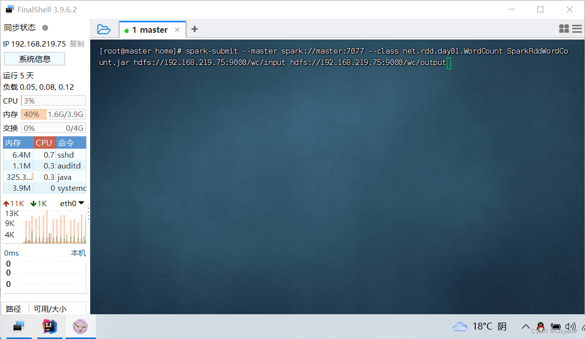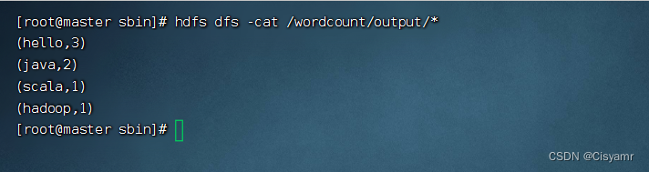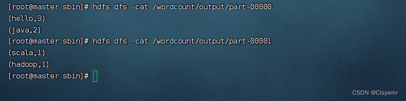 - hdfs://192.168.219.75:9000/wc/output:统计结果的输出路径。与MapReduce一样,该目录不应提前存在,Spark会自动创建。