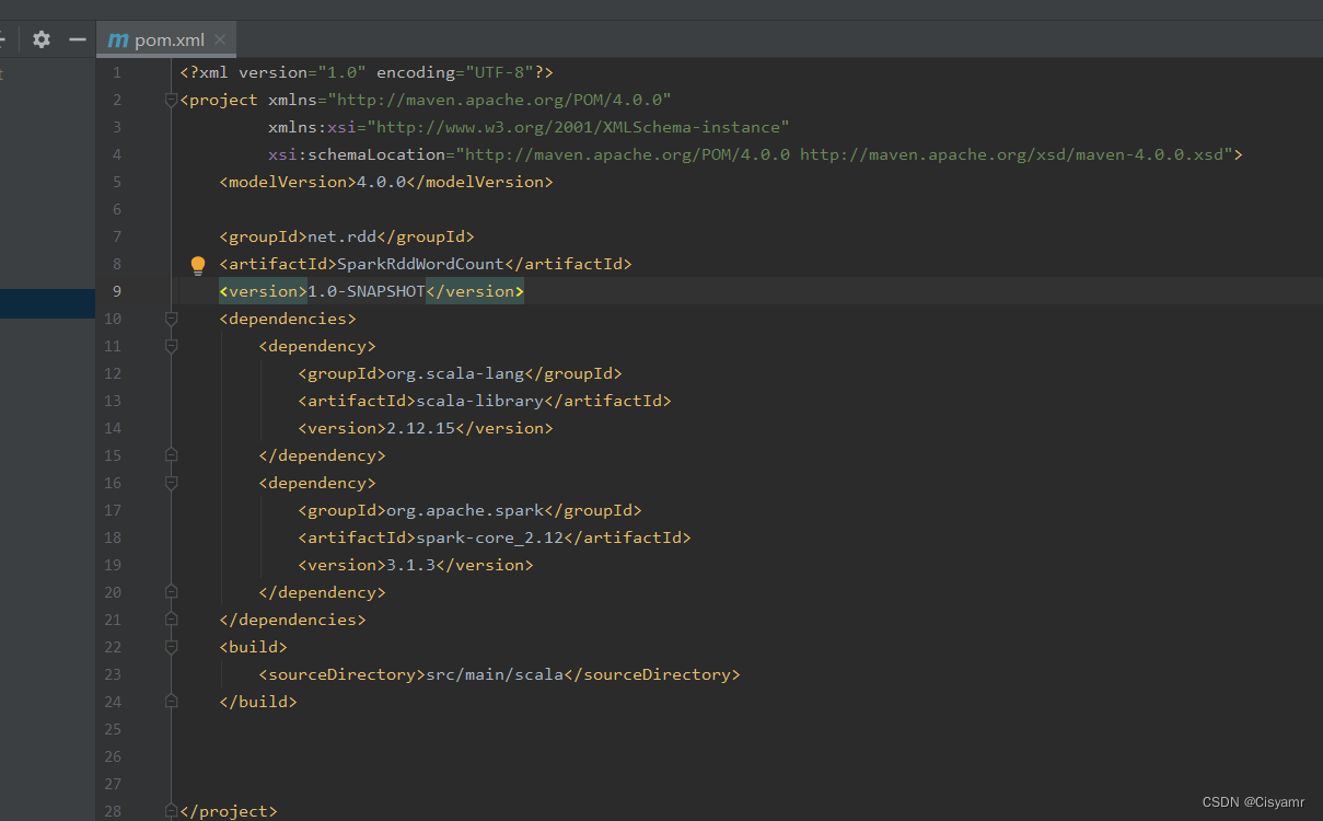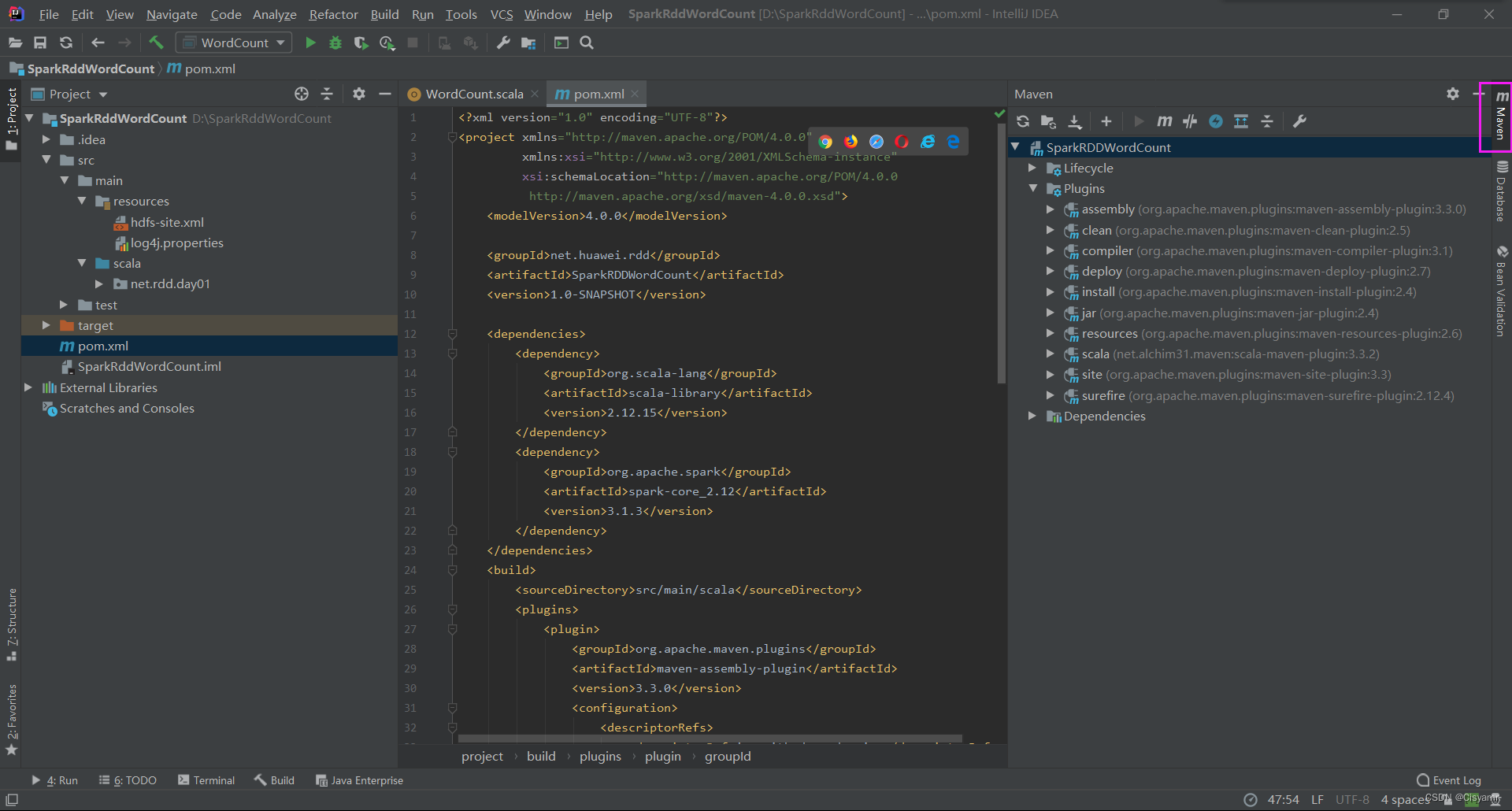 - 在IntelliJ IDEA中新建Maven管理的Spark项目,在该项目中使用Scala语言编写Spark的WordCount程序,可以本地运行Spark项目查看结果,也可以将项目打包提交到Spark集群(Standalone模式)中运行。