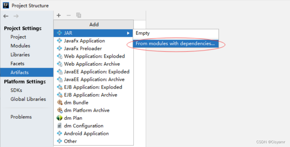 JAR子菜单里选择第二项From modules with dependencies...,设置主类以及JAR文件