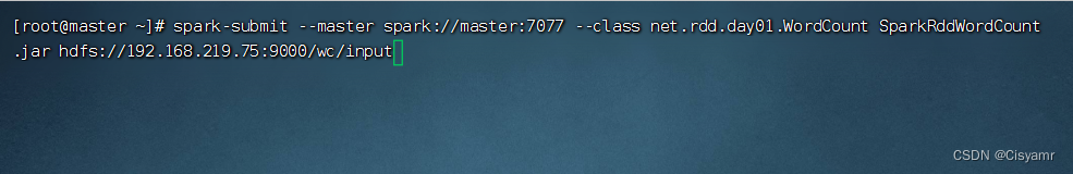 spark-submit --master spark://master:7077 --class net.rdd.day01.WordCount SparkRddWordCount.jar