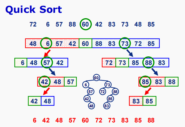 每次都把数据分成左右两部分,左边的小于某个数,右边的大于某个数。