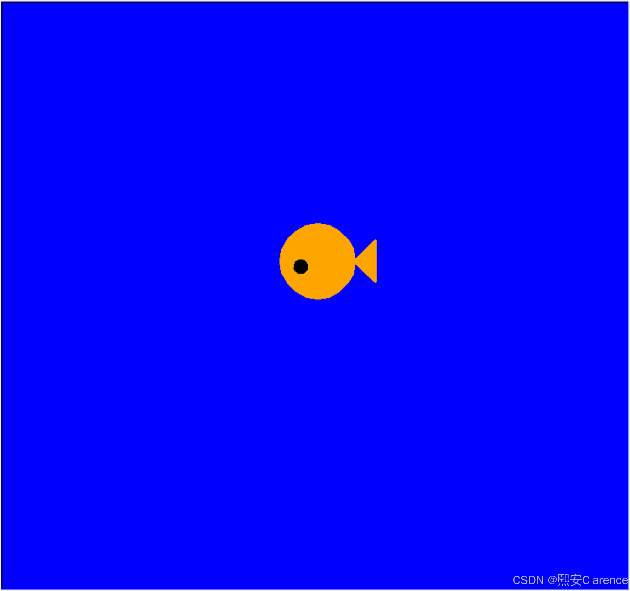 思路是先把背景调成蓝色,然后画一个橙色的圆和一个橙色的三角形当小鱼的头和尾巴,然后画一个黑色的圆当小鱼的眼睛